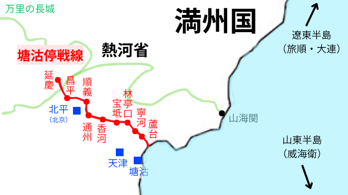 塘沽というのは停戦協定が結ばれた場所で、万里の長城よりはるか南方にある天津の東隣に位置する都市です。要所であった北平(北京)と天津を防衛するために、北平・天津・塘沽北部で停戦ラインを引き、その周辺領域を非武装、緩衝地帯と定めました。