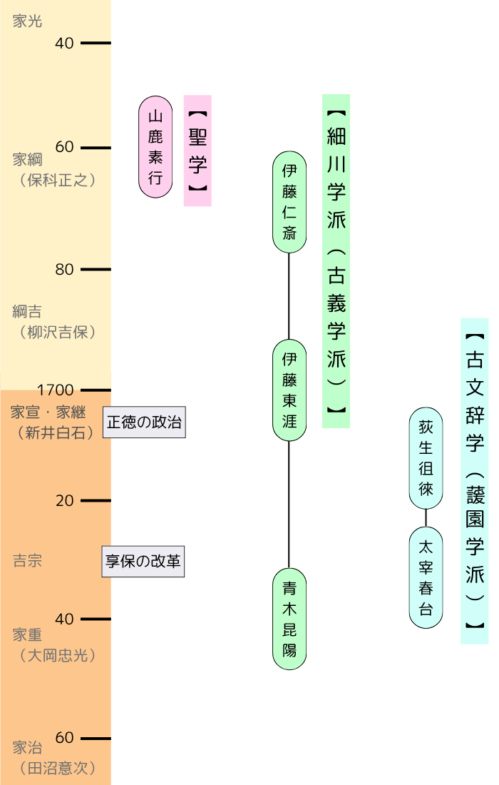 - 古学:古代の聖王の教えに立ち返ることを主張した(=儒学)。儒学との違いは、朱子学批判を含んでいる点。