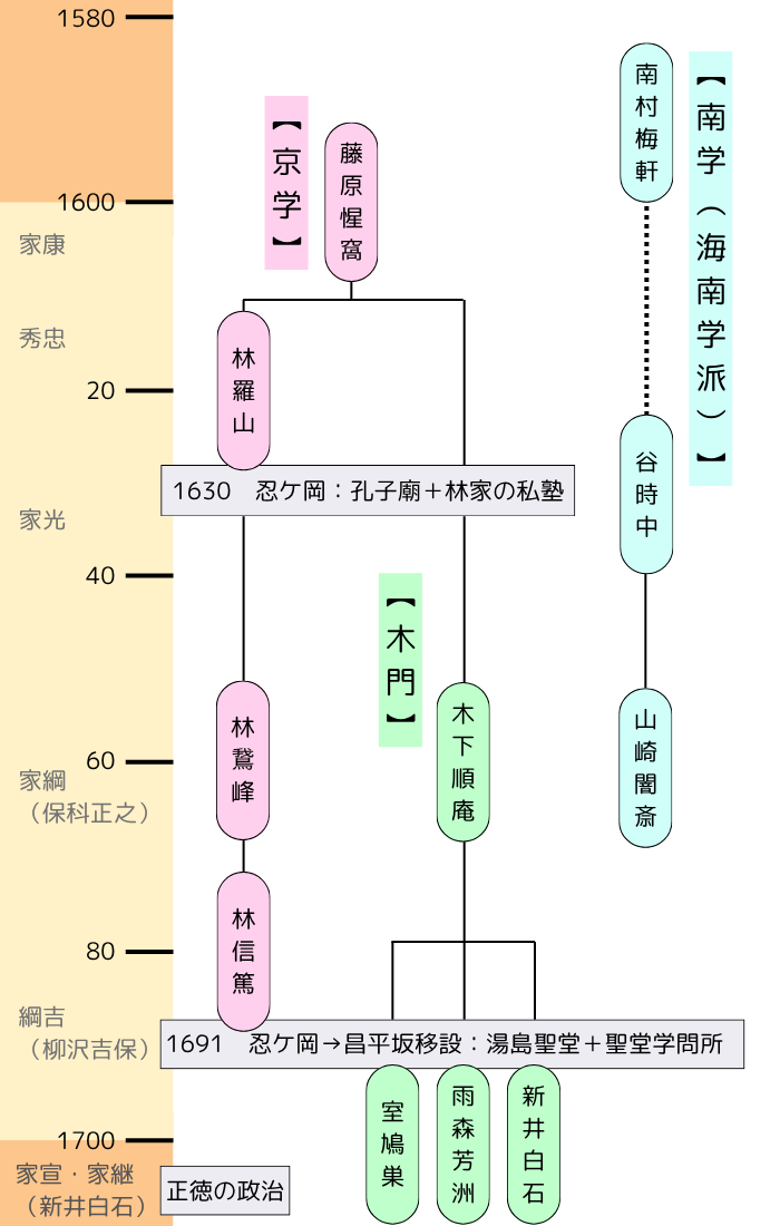 藤原惺窩を祖として、京学と木門(もくもん)に分派します(京学の祖が藤原惺窩とする場合もある)。京学と呼ばれる理由は、もともと藤原惺窩が京都相国寺の禅僧であったためです。継承した林家の祖、林羅山も京都建仁寺の禅僧でした。対して木門は、祖である木下順庵の名字から取られています。