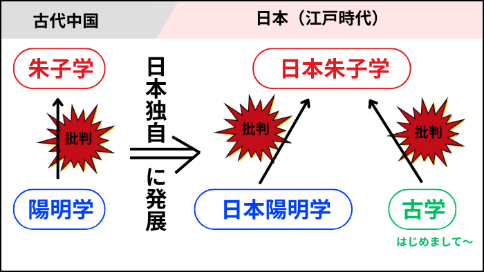 ここでの誕生というのは、日本流の朱子学、日本流の陽明学の誕生のことです。朱子学も陽明学も既に古代中国に存在していた宗派であることにご注意ください。これらが江戸時代に日本で注目されるようになり、日本流にかたちを変えて発展したというわけです。古学は完全に日本オリジナルの宗派で、陽明学と同様に朱子学に対抗するかたちで誕生しました。