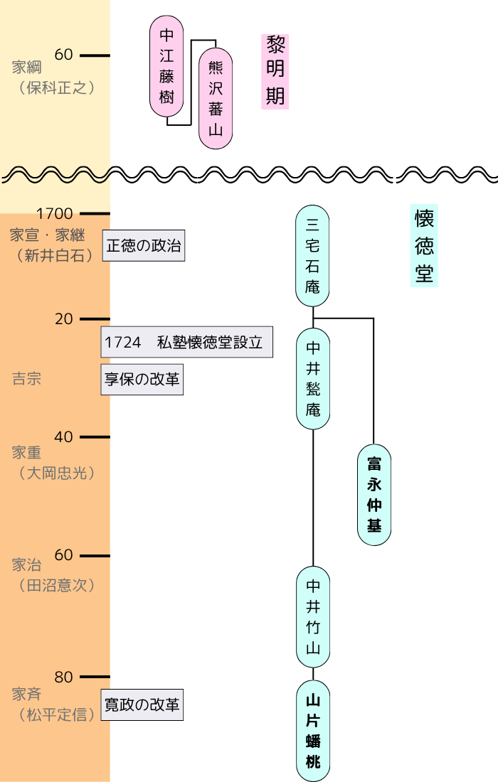 - 1750(富永仲基)懐徳堂の異端児であったため、分岐。釈迦の教えを否定する過激派で、陽明学からも危険視されていたが、行動を起こすことはなかった。